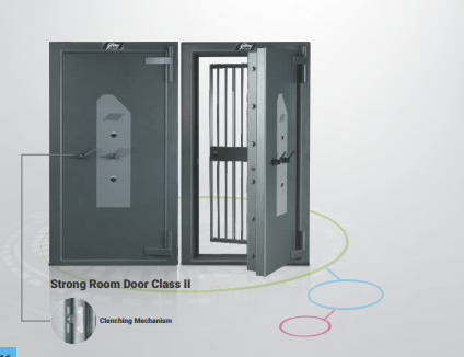Establishments like banks and businesses are always under the scanner of unscrupulous eyes, raising an everincreasing threat to their security. As technology evolves, break-in attempts are also getting more sophisticated with burglars using advanced state-of-the-art tools to attempt their brazen heists. Needless to say, the first step is to fortify the first point of attack - the strong room door. Godrej Strong Room Doors combine unique Double Duty Barrier (DDB) material and Torch & Drill (TDR) Matrix to offer superior resistance, not only against common hand tools, picking tools and impact tools, but also against oxy acetylene torches. Consists of a composite slab of thickness 18mm, made of a special layer of flame and arc-resistant alloy that protects against fire, power drilling, oxy acetylene torch and arc cutting. It is further fortified with a composite 62mm layer of Godrej Double Duty Barrier (DDB). Consists of a 25mm slab of Torch & Drill Matrix Slab (TDR), to protect it from attacks by impact tools, drills, oxy acetylene torch and arc cutting. It is further fortified with a 65mm layer of Godrej Double Duty Barrier (DDB). Door comes along with clenching mechanism.