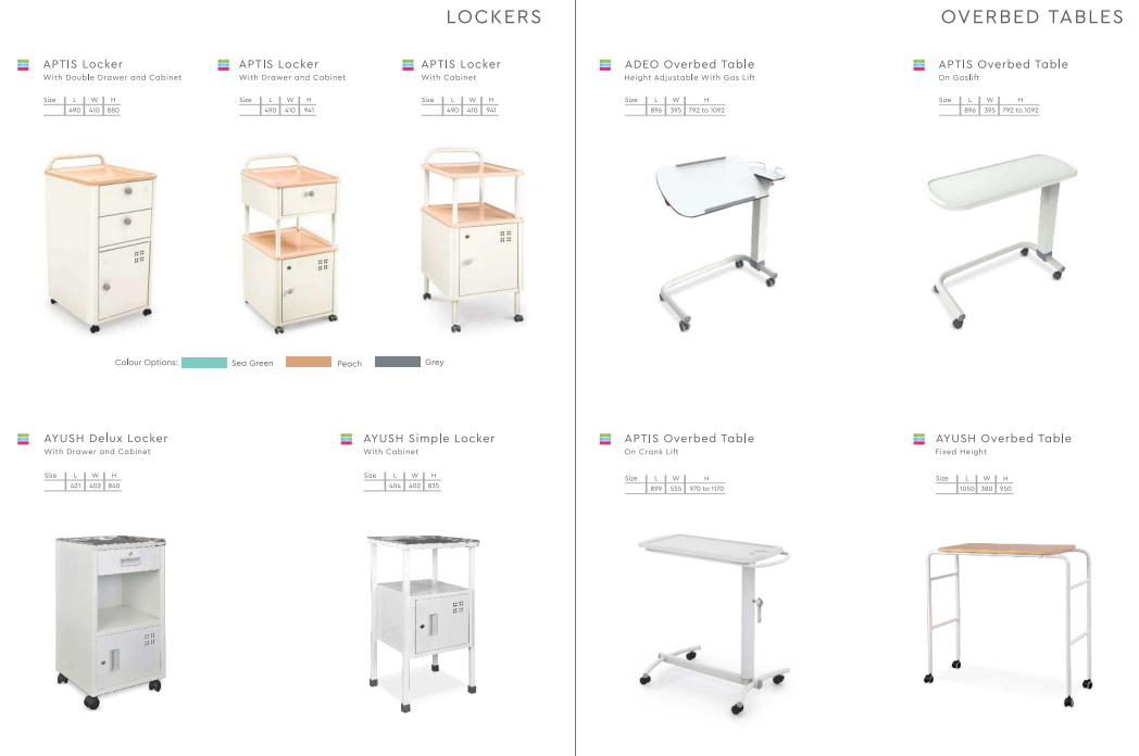 The bedside cabinet range is an extension of addition to medical beds. These cabinets can be used both when the resident/patient is in bed or chair providing invaluable support in everyday activities. Range of Aptis bedside cabinets are highly diversified with 3 different models meeting all the needs. The lockers are provided with locks for safety and anti microbial powder coating. The locker is also provided with front locking castors to keep the locker in place. The locker is provided with U shaped handle that helps in easy movement of the lockers when needed.