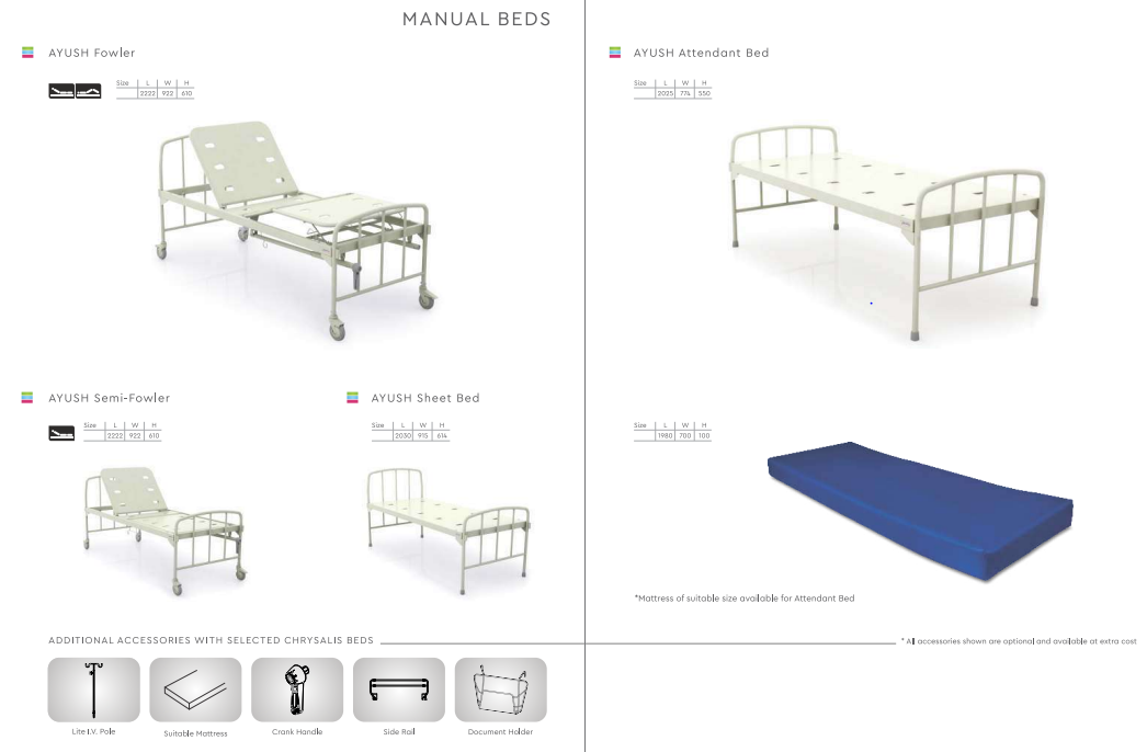 Ayush plus range of patient care beds, which are CE certified and built to promise: patient comfort, caregiver convenience, unparalleled safety, ease of mobility and ease of maintenance. Additionally, they incorporate a wide range of value-added features, compatibility with multiple accessories, elegant aesthetics and flexibly designed to match the needs of intensive care.