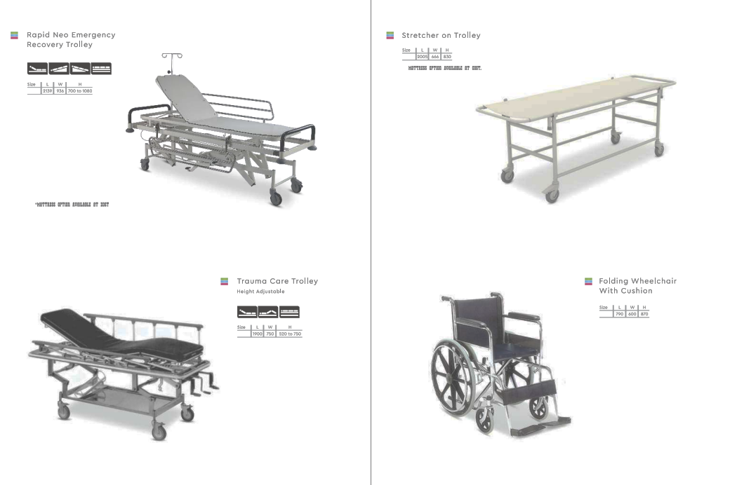 The patient mobility range is an extension to medical beds used in movement a casualty from ambulance to OT or other critical procedures. The Stretcher trolley has been designed for Speed, safety and comfort. Emergency Recovery Trolley is used in emergency areas to give first aid to patients. Patients can be examined in sitting position and supine position. This allows the doctor to interact with the patient while maintaining an eye to eye contact giving good access.