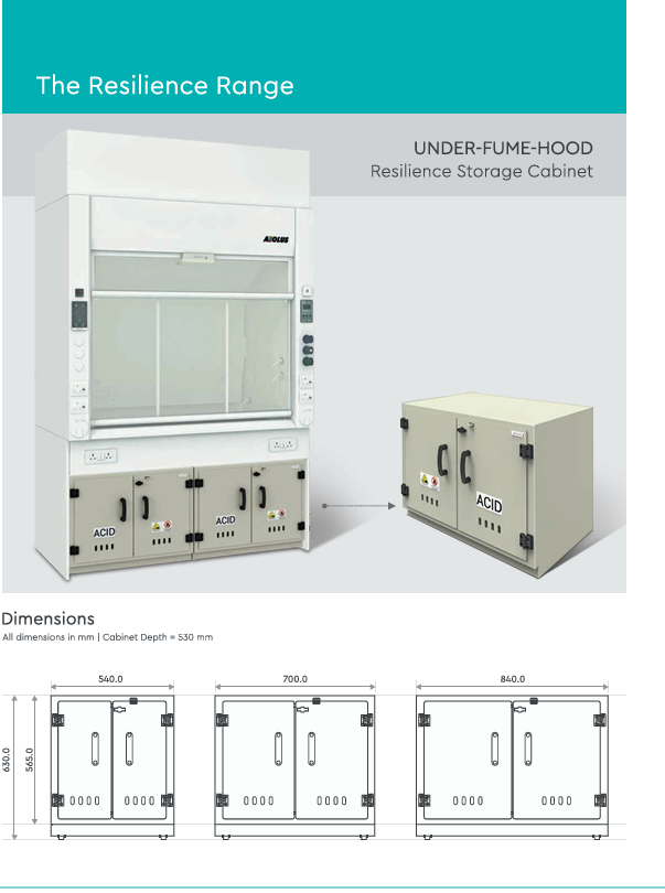 Resilience cabinets are used to store highly corrosive acids They are made completely from Polypropylene (PP) with no exposed metal parts or hardware and hence are corrosion resistant The PP shelves are in the form of Collection trays that can be removed easily and can be height-adjusted as per the end-user's requirement The cabinet is equipped with an air duct to effectively extract fumes and louvers have been provided in front doors of the cabinet to allow fresh air in The tray-type shelves are leak-proof and contain the complete spillage, with each tray capable of taking 30 kg UDL
