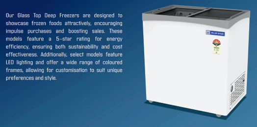 Our Glass Top Deep Freezers are designed to showcase frozen foods attractively, encouraging impulse purchases and boosting sales. These models feature a 5-star rating for energy efficiency, ensuring both sustainability and cost effectiveness. Additionally, select models feature LED lighting and offer a wide range of colored frames, allowing for customisation to suit unique preferences and style.