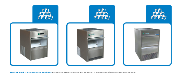 Gourmet Ice Cube Machines: Gourmet Ice Cube Machines produce compact truncated cone format ice cubes with slightly indented facets. These gourmet ice cubes gives a refreshingly cool boost to your drinks without changing the flavour.